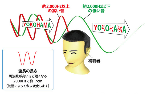 図にあるように2,000Hzの1波長は17cm、それ以上高い周波数は回析しづらく、反対の耳には聞こえ難くなるため、「s」「k」「f」などの子音は聞き取れず、「さ」と「か」、「く」「ふ」などはしばしば聞き間違いが起き、佐々木さん→ああきさん、佐藤→加藤、鈴木→ステキ、など別な言葉に変化する異聴と言う現象も起きます。