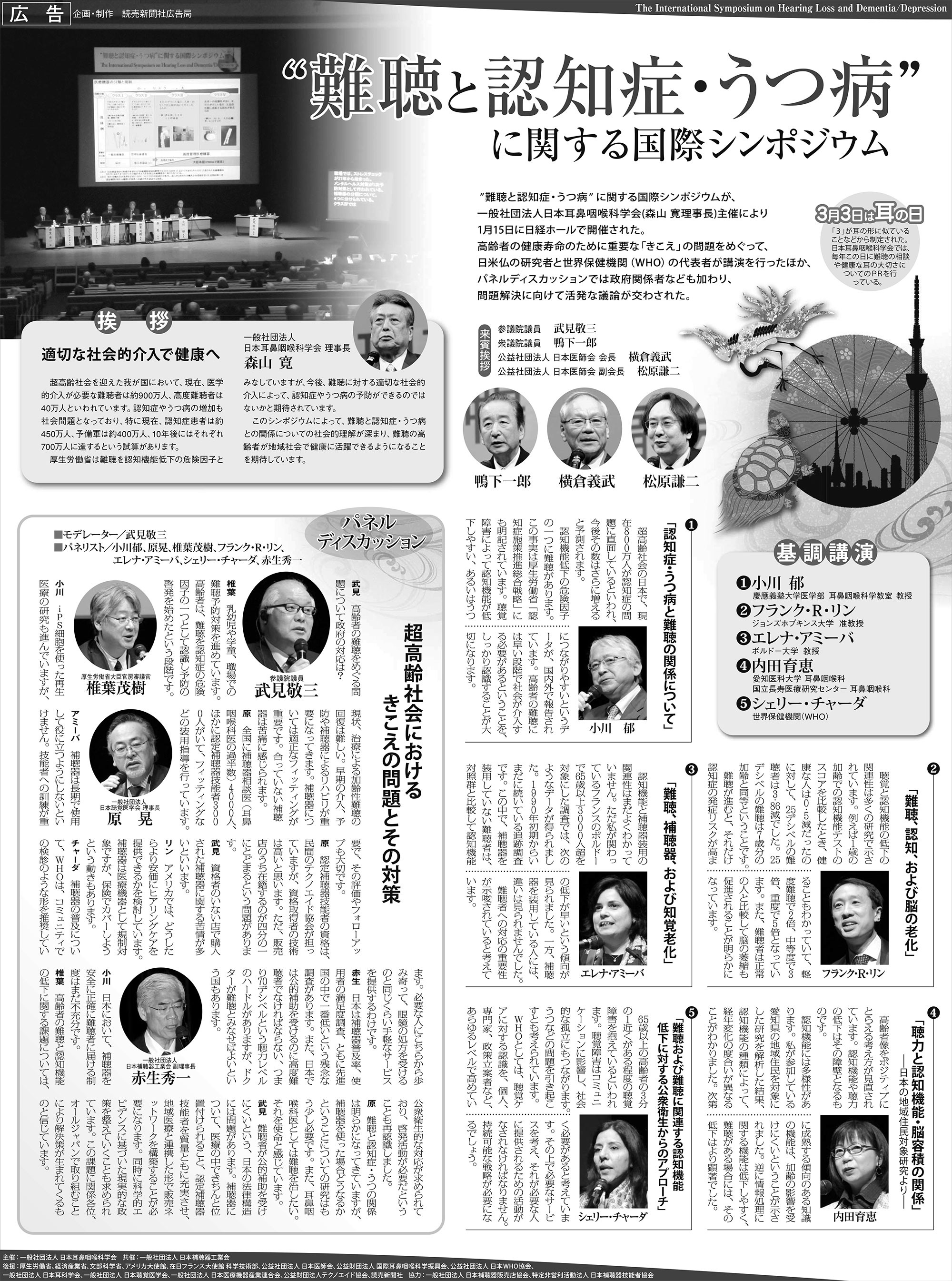 “難聴と認知症・うつ病”に関する国際シンポジウム ニュース 2017年01月17日(火曜日) 2017年1月15日(日)、日経ホールで「“難聴と認知症・うつ病”に関する国際シンポジウム」が開催されました。 主催は一般社団法人日本耳鼻咽喉科学会(森山寛理事長)。 高齢者の健康寿命のために重要な「聞こえ」に関して、日仏米の研究者と世界保健機関(WHO)の代表者が講演を行い、パネルディスカッションでは政府関係者なども加わり、問題解決に向けて活発な議論が交わされました。 聞こえるっていいですね。